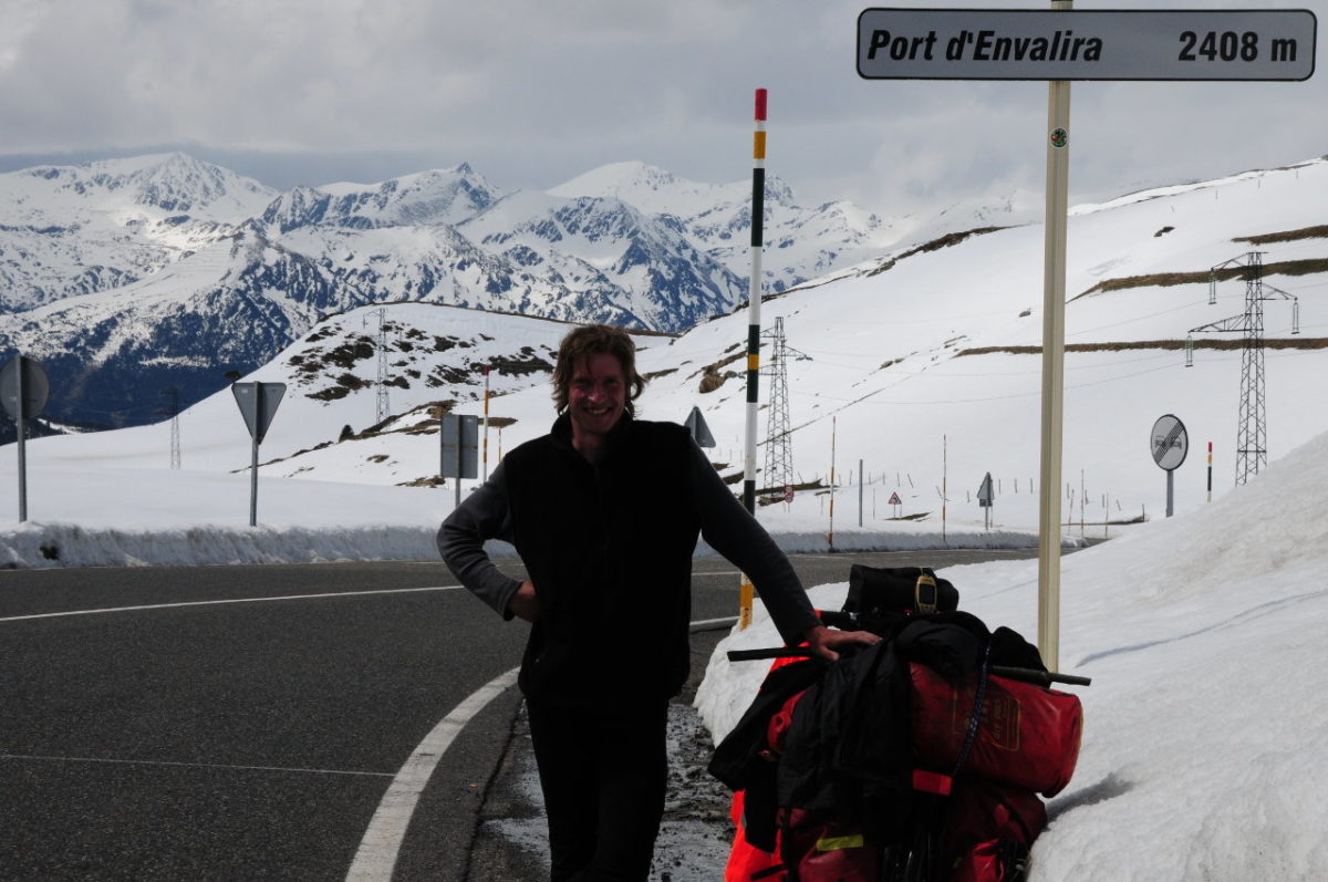 Ich habe es geschafft. Zweibrücken-Andorra 2010 ist Geschichte. Um 15:24 stehe ich neben dem Schild ‚Porte d’Envalira 2408 m‘ Das Thermomenter zeigt 6 Grad. Die Sonne scheint. Von Unwettern blieb ich verschont. Tag 22 des Kunstprojekts (im Jahr 2000 stand ich schon an Tag 17 hier oben). Ich bitte einen Mann, ein Gipfelfoto von mir und Fahrrad neben dem Schild zu machen. Seine Kinder tollen im Schnee. Der Mann ist Niederländer. Das hatte ich zunächst nicht bemerkt, da er ziemlich gut französisch spricht. Ab nun geht es nur noch abwärts. Andorra ist eigentlich eine schiefe Ebene. Das Land besteht aus ein paar Flusstälern, die sich in La Vella treffen. Keuchte ich die letzten Höhenmeter im ersten Gang durch die dünne Luft, 5 bis 8 km/h langsam, geht es nun rasant mit bis zu siebzig Sachen abwärts. Soldeu, Encamp, Skiorte. Auffällig die vielen Baustellen und mit ihnen Divisionen von Betonmischfahrzeugen, aufwärts im ersten Gang dieselrußstinkend mir entgegen, abwärts als langsames Hindernis ebenso dieselrußstinkend, sonor motorbremsend vor mir. Andorra ist ein Phänomen. Oberflächlich betrachtet ist es ein gigantischer Supermarkt, in dem man allerlei nutzloses Zeug kaufen kann. Zollfrei oder -reduziert heißt das Zauberwort. Ich denke, ein Großteil des Verkehrs rührt vom Tagestourismus all der Komm lass uns mal schnell tanken, Zigaretten und Kaffee kaufen-Leute. Im alten Tagebuch fabuliere ich, dass man die Geschäfte in den Fels gemeiselt hat, sie mit teuren Uhren, elektronischen Gadgets bestückte, eine Glaswand davor, Zigaretten stangenweise, Nutella in 5 Kilo-Packungen, alles in gigantisch, verbilligt … kaufmichtot. In der Tat hatte ich in den Geschäften Probleme, Nahrungsmittel in normalen Portionen für den Tagesbedarf eines Reisenden zu kaufen.